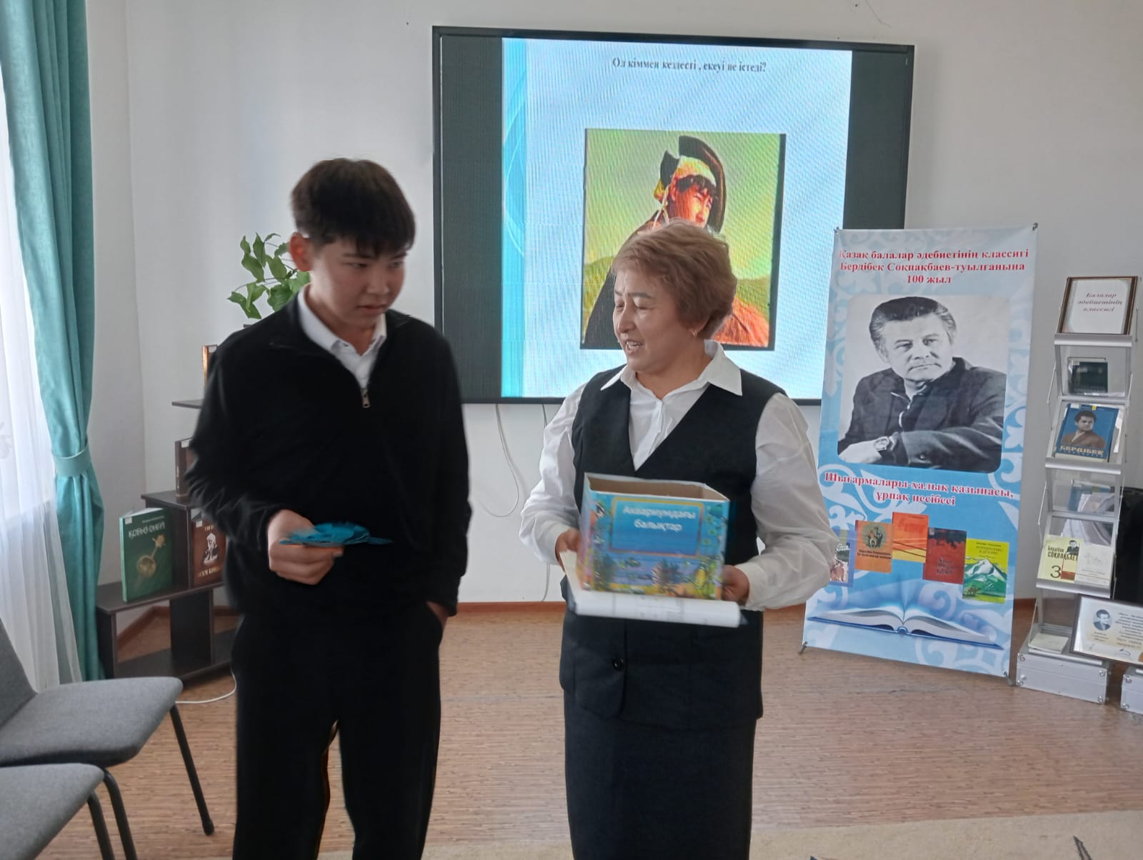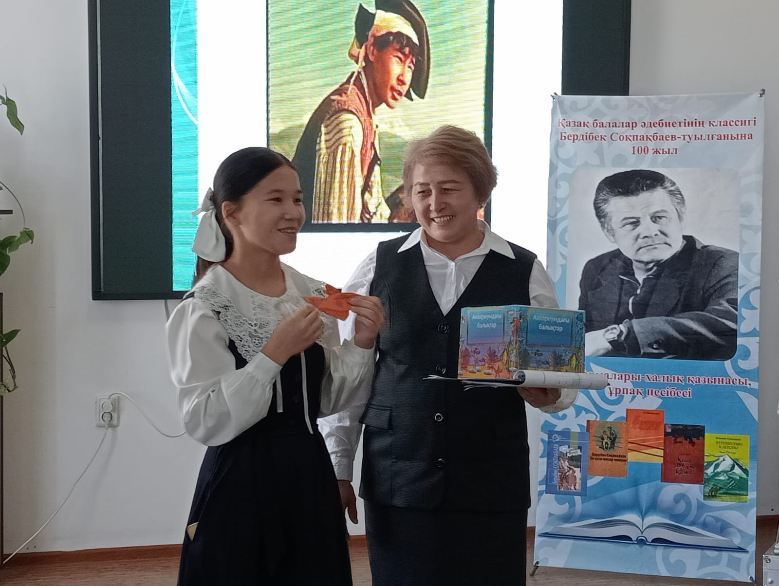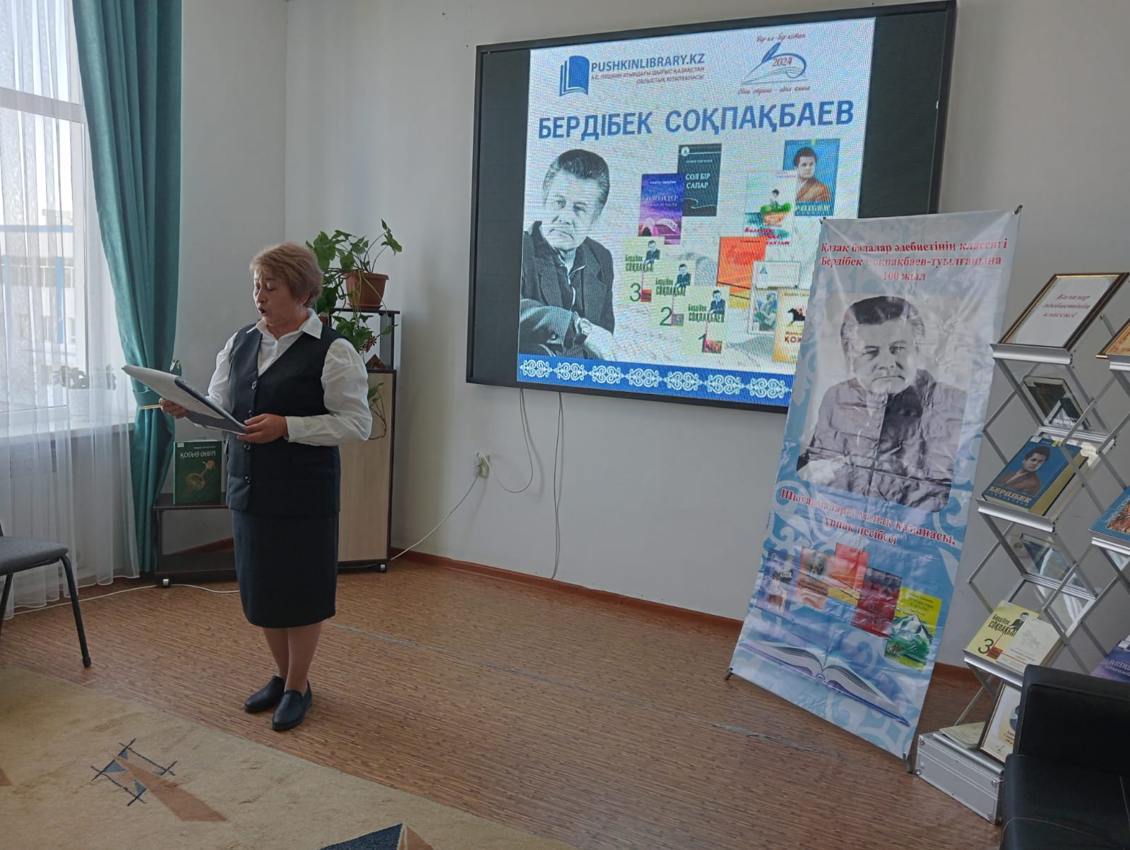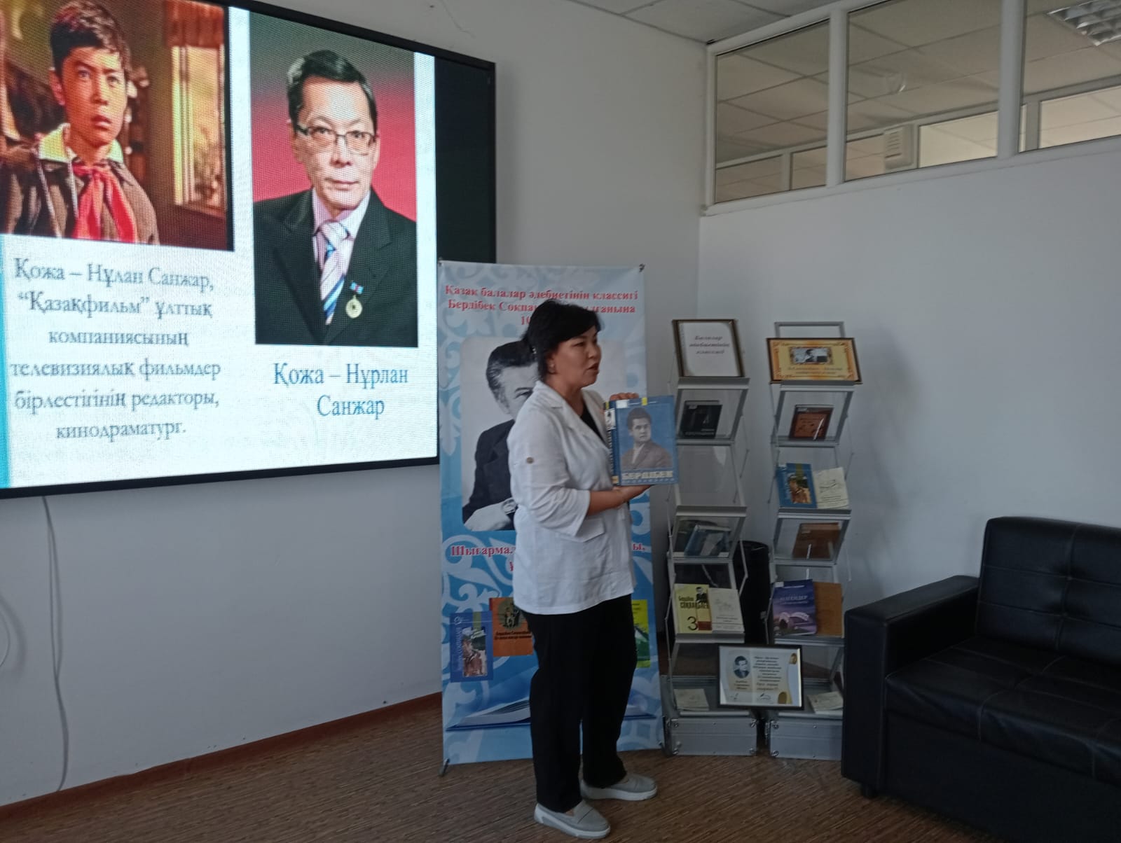 Кешке "Бердібек Соқпақбаев - балалар әдебиетінің классигі"атты кітап көрмесін қызмет көрсету бөлімінің кітапханашысы А.Құрымбаева таныстырып, библиографиялық шолу жасады және «Халқын сүйген қаламгер» слайд көпшілік назарына ұсынылды.