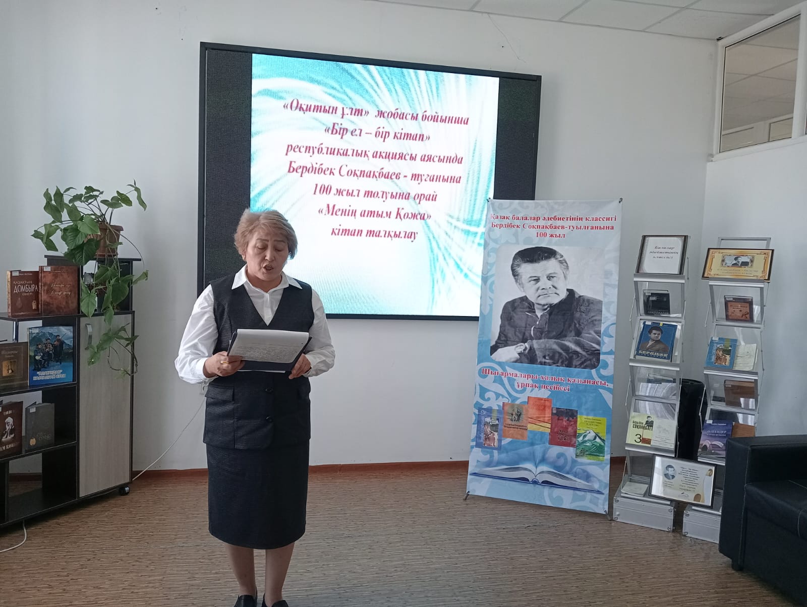 Аудандық орталық кітапхана оқырмандарына арналған «Оқитын ұлт» жобасы бойынша «Бір ел- бір кітап» республикалық акциясы аясында Бердібек Соқпақбаев - туғанына 100 жыл толуына орай «Менің атым Қожа» тақырыбында Юрий Гагарин атындағы мектеп-лицейінің 9 сынып шәкірттері арасында кітап талқылау кеші өтті.