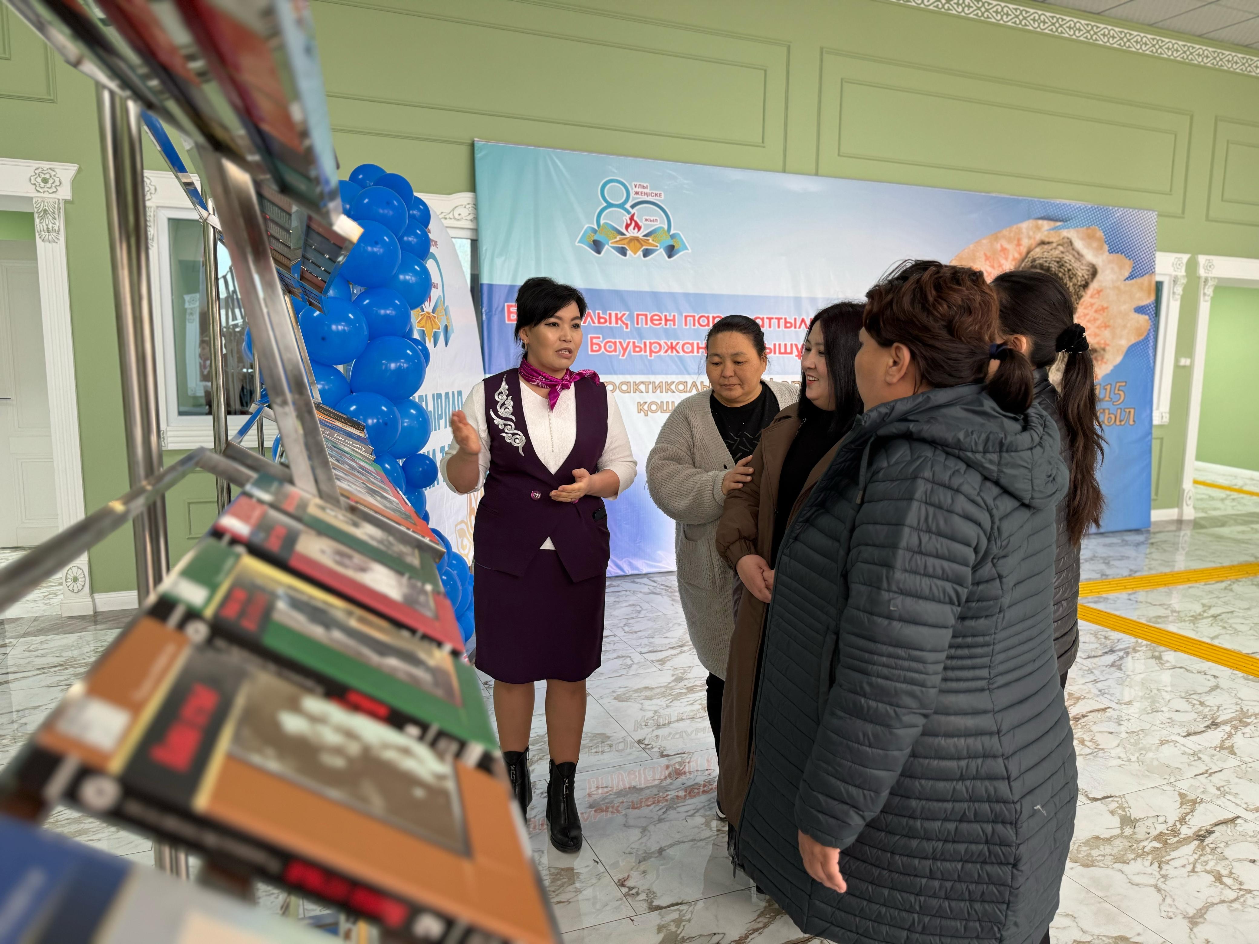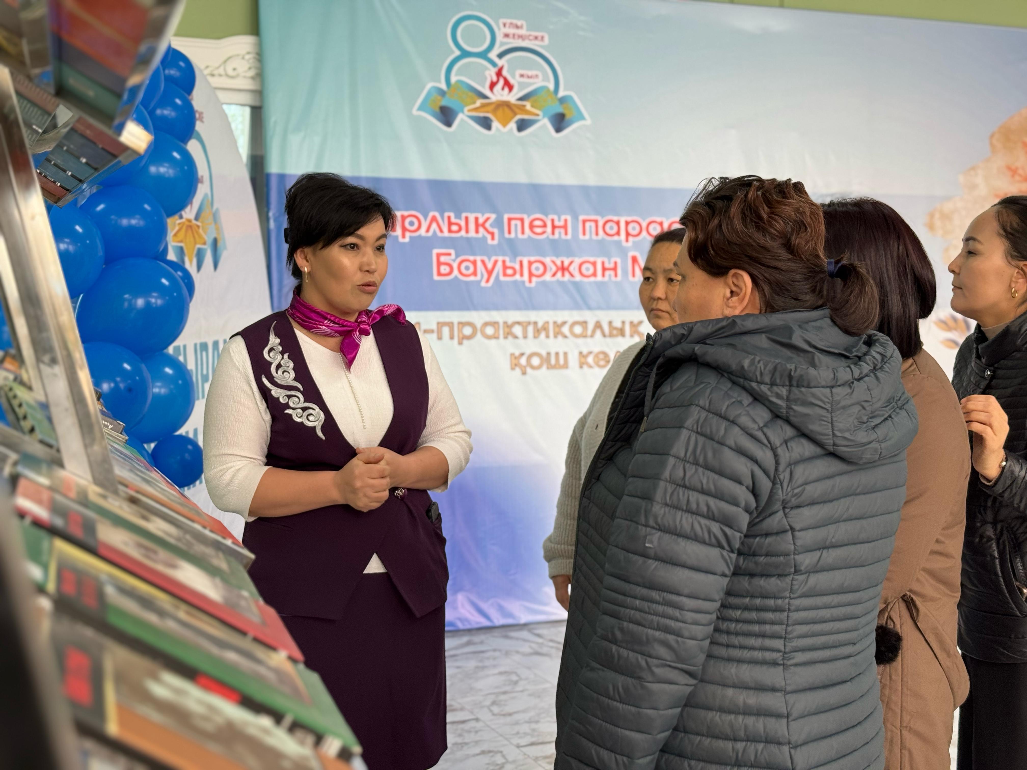 Іс-шарада кітапхана қызметкерлері конференцияға келген қонақтарға Бесағаш ауылдық кітапханасының меңгерушісі Сандуғаш Әміржанова Ұлы Жеңістің 80 жылдығы аясында Қазақтың даңқты батыры, жазушы, ойшыл тұлға Бауыржан Момышұлының 115 жылдығына арналған жазушының шығармаларынан тұратын кітап көрмесін таныстырып, «Ұшқан ұя», «Генерал Панфилов», «Куба әсерлері», «Москва үшін шайқас», «Көз алдымда бәріңсің», «Қанмен жазылған кітап» атты библиографиялық шолу жасады. Аудандық орталық кітапхананың библиогрфы Ақерке Мамашариева батырдың қолжазбалары өз қолымен жазылған қазақ халқының рухани мұрасын ерекше құнды қолжазбалары мен батасын оқырмандар назарына ұсынды. Сонымен қатар, аудандық балалар мен жасөспірімдер кітапханасының кітапханашысы Хожамкулова Замира Бауыржан Момышұлының өмірі мен қызметін бейнелейтін фотосуреттері мен қанатты сөздерінен тұратын библио- галареяны көрермендерге таныстырды.