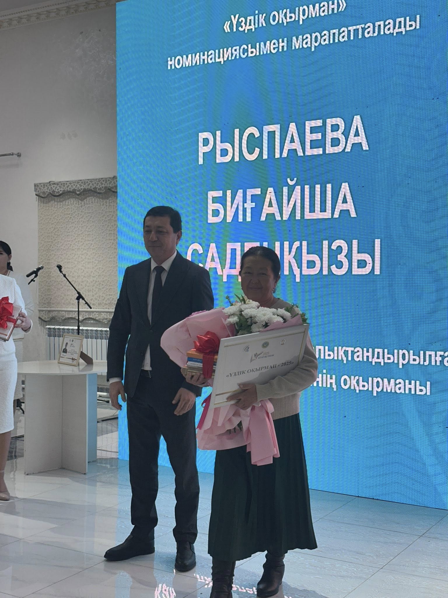 «Үздік оқырман» номинациясы бойынша Жамбыл аудандық орталық кітапхананың тұрақты оқырманы Рыспаева Биғайша "Үздік оқырман" атанды.